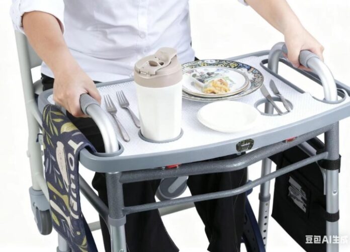 With a tray and storage bag attached to their walker, individuals can carry items without relying on assistance from family members or caregivers.